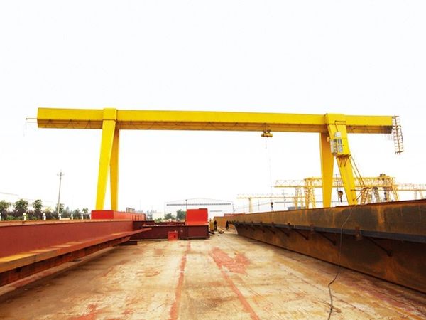 结构形式与MG型起重机基本相同,一侧有支腿,在地面轨道上运行;另一侧无支腿,在厂房上部的轨道上运行。